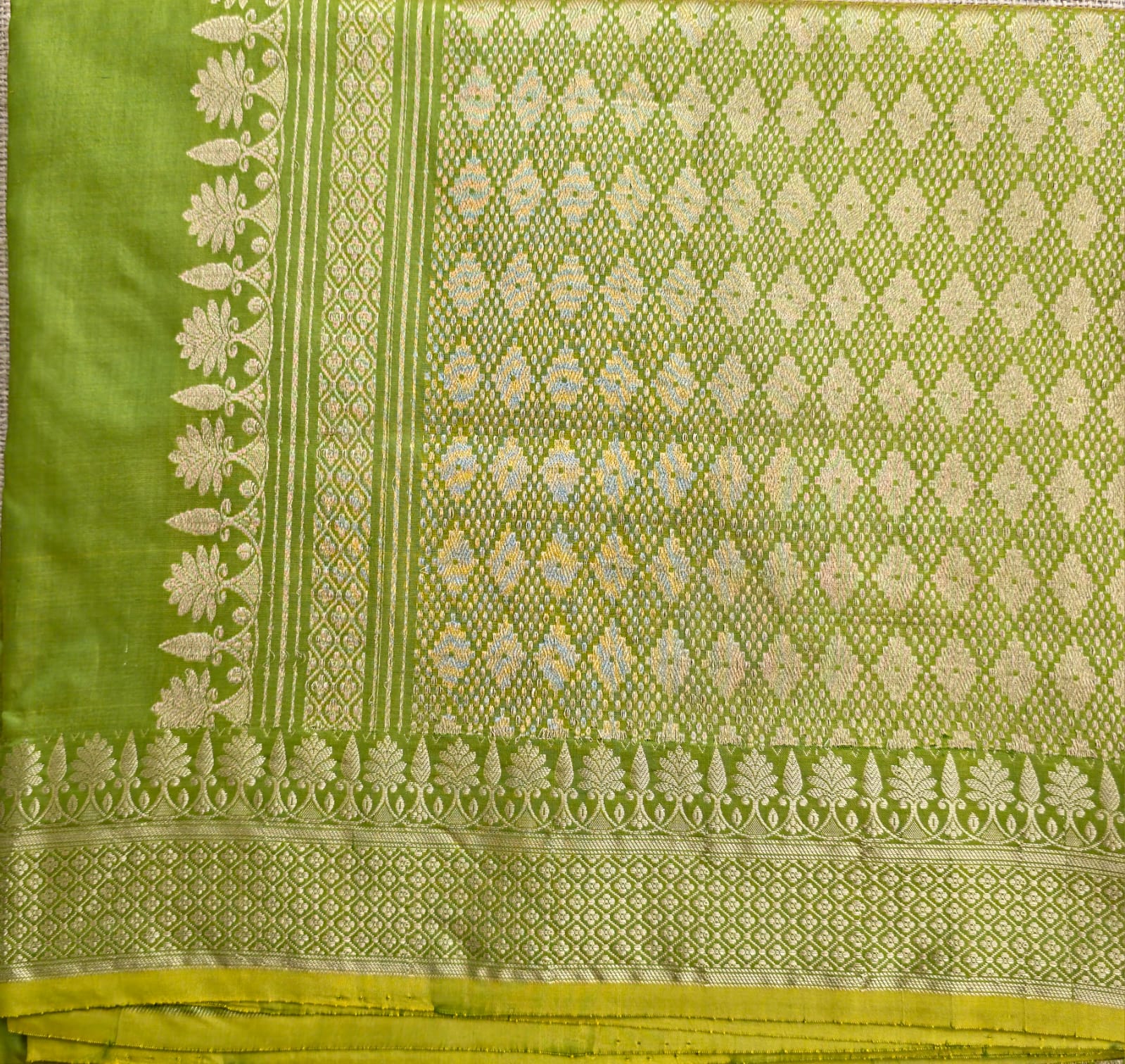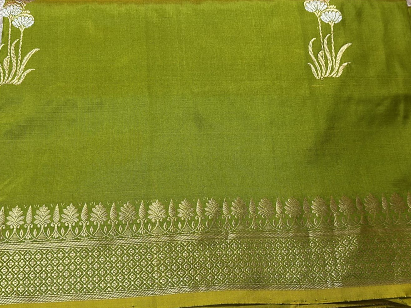 Mehendi Green Banarasi Katan Pure Silk Saree with Sona Rupa floral zari motifs – a handloom masterpiece for weddings and festive celebrations. A perfect blend of quality and value, this saree brings timeless Banarasi craftsmanship to your wardrobe