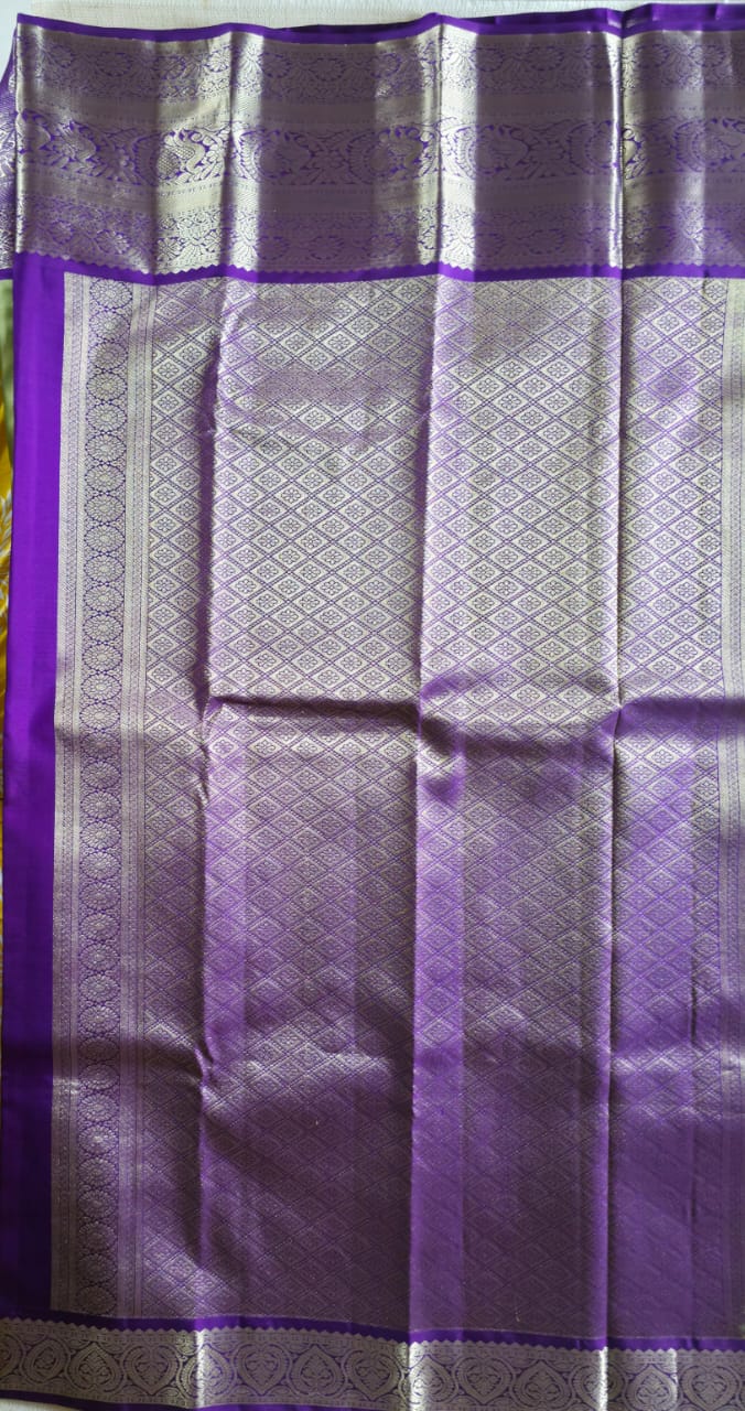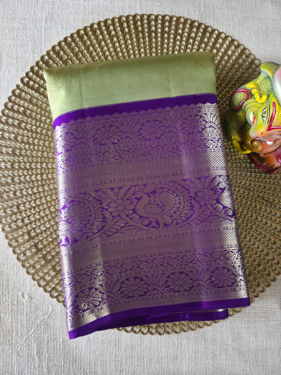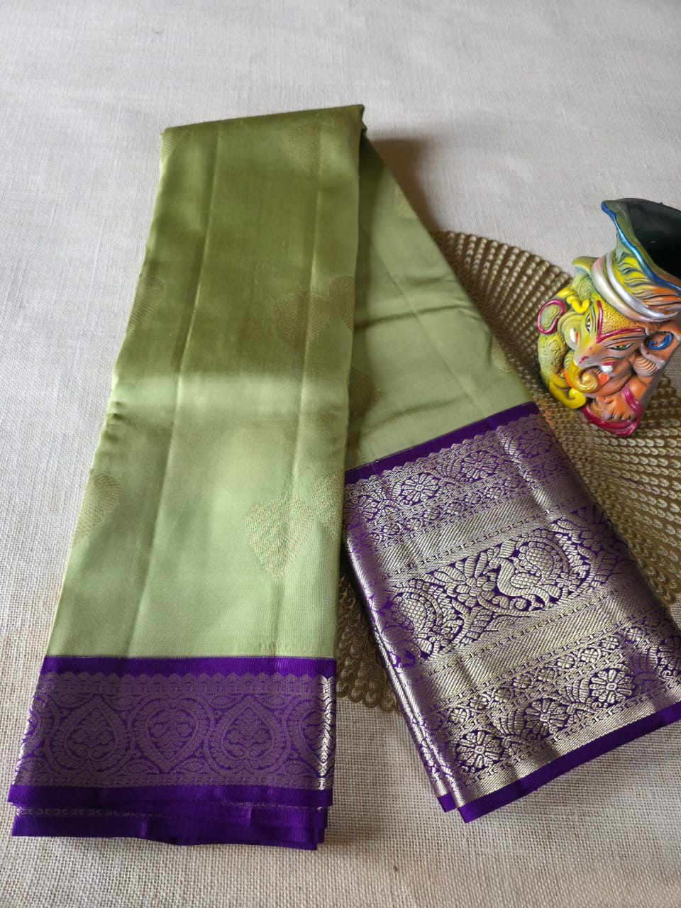 Radiating elegance and rare charm, this Pure Silk Kanchipuram Saree features a serene pistachio green body, delicately woven with understated motifs that exude refined taste. The rich royal purple border and pallu, adorned with intricate silver zari peacock and floral designs, create a striking contrast — a true testament to South Indian weaving mastery. Perfect for weddings, festive occasions, and cultural celebrations, this saree blends tradition with an unconventional color palette that’s bound to turn heads.