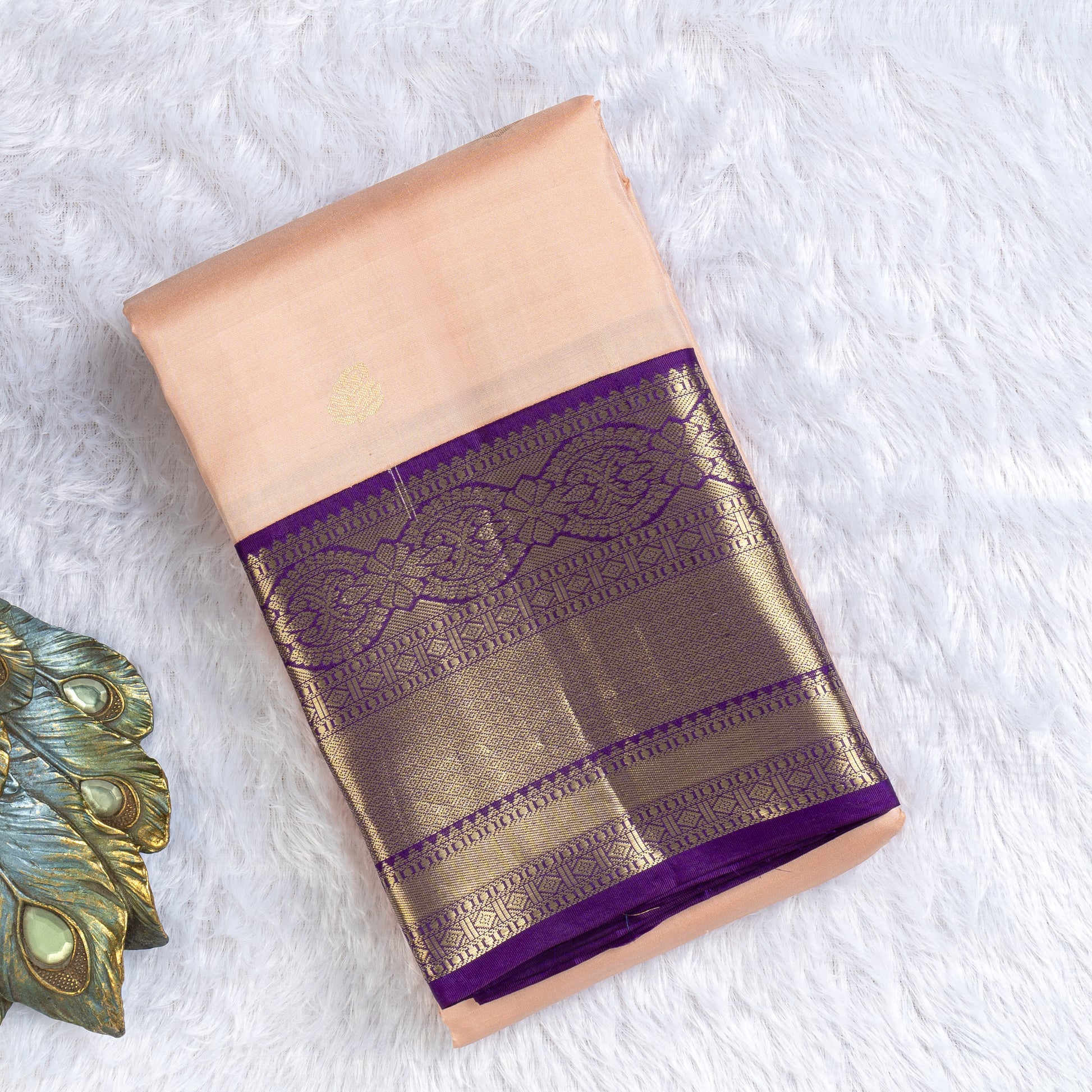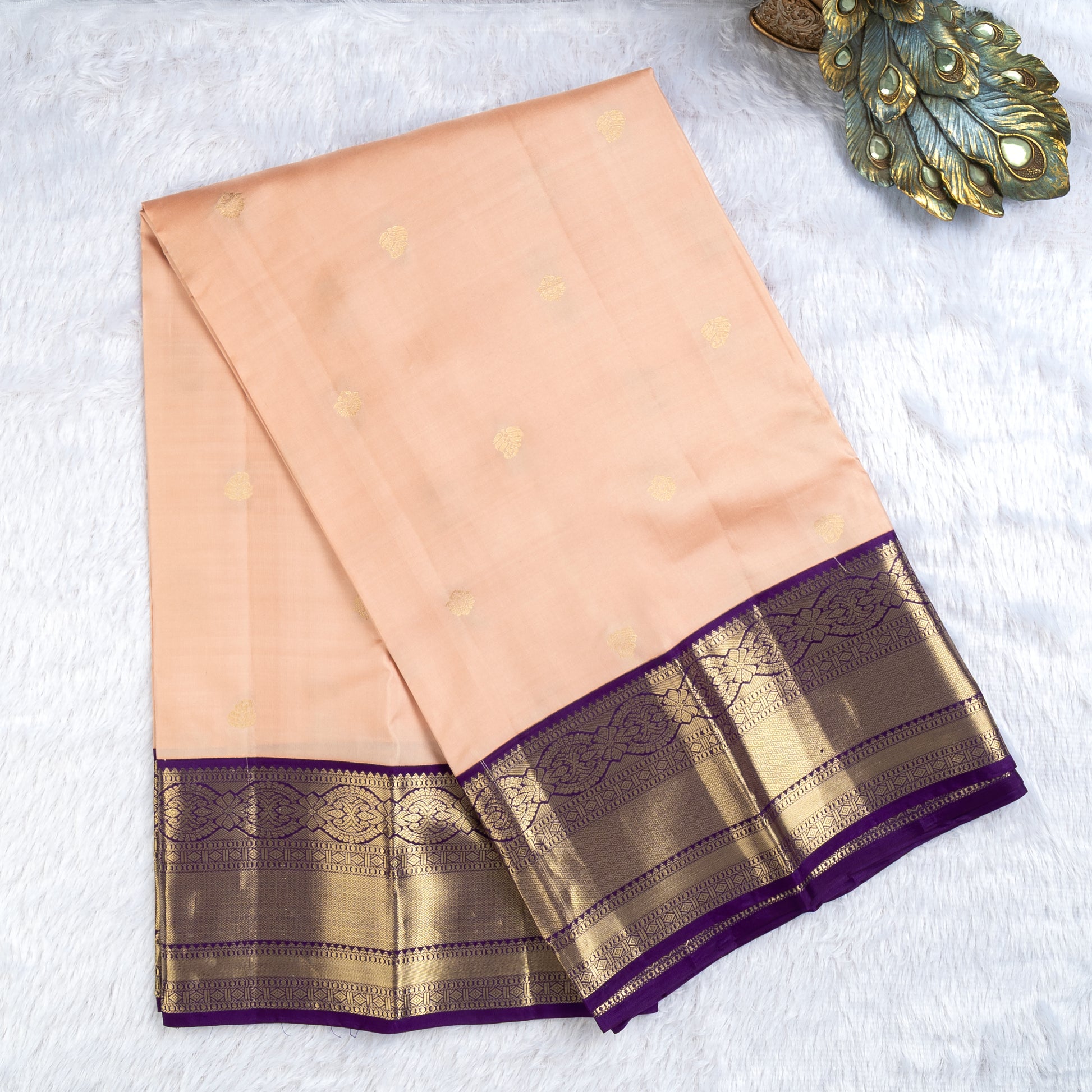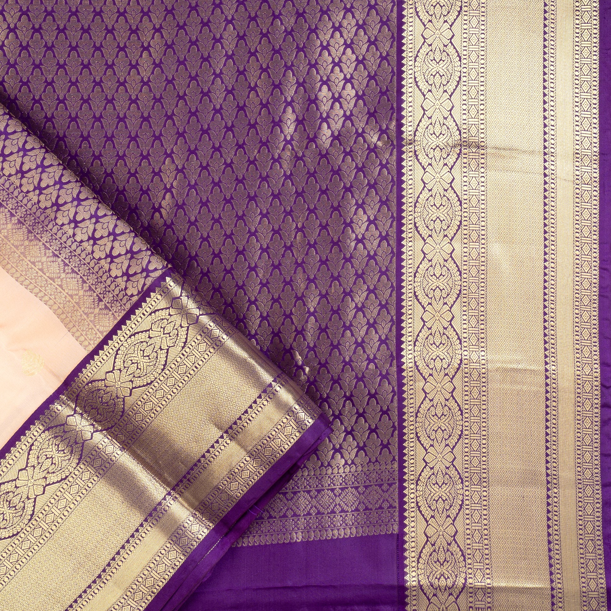 Color: Blush pink body with royal purple border & pallu