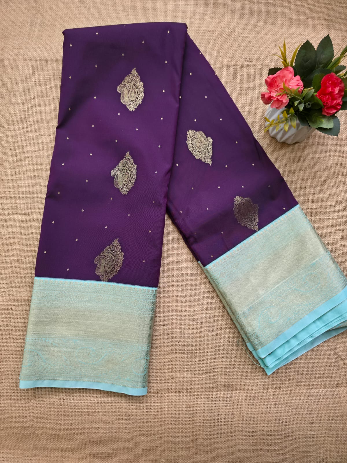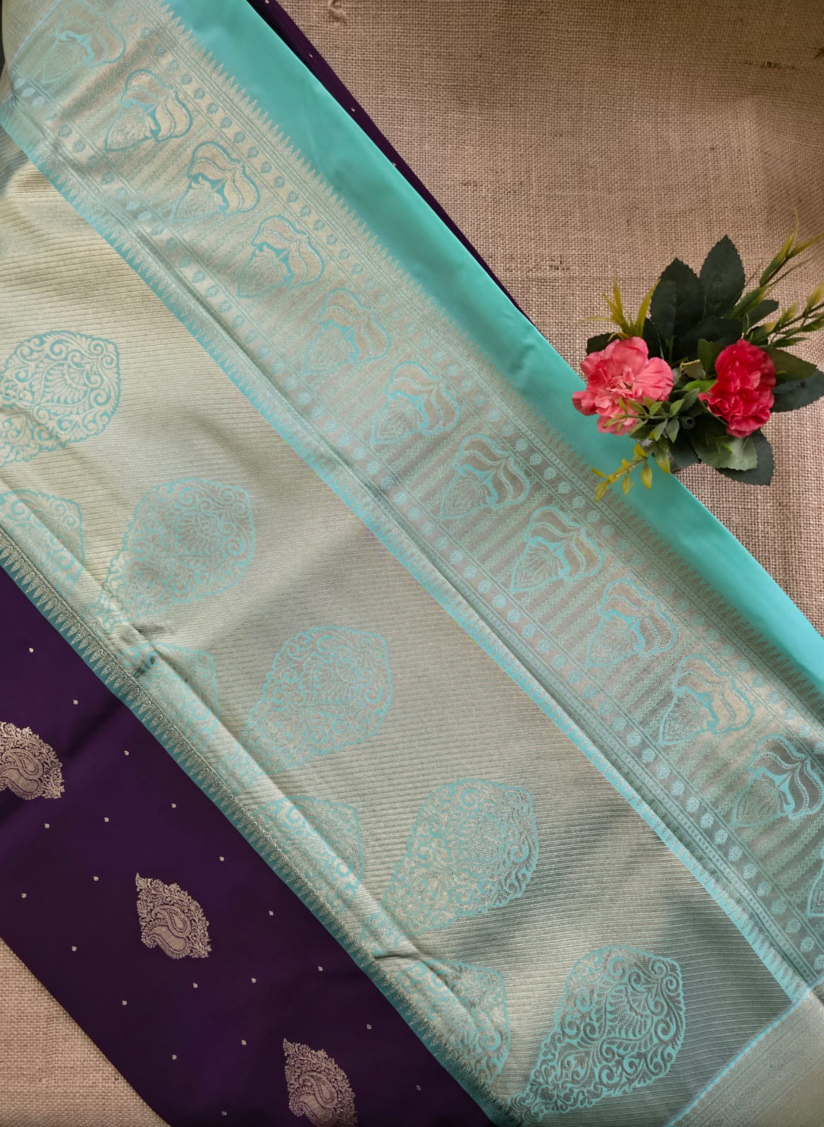 Semi Silk Korvai Purple and Turquoise Blue border/plallu