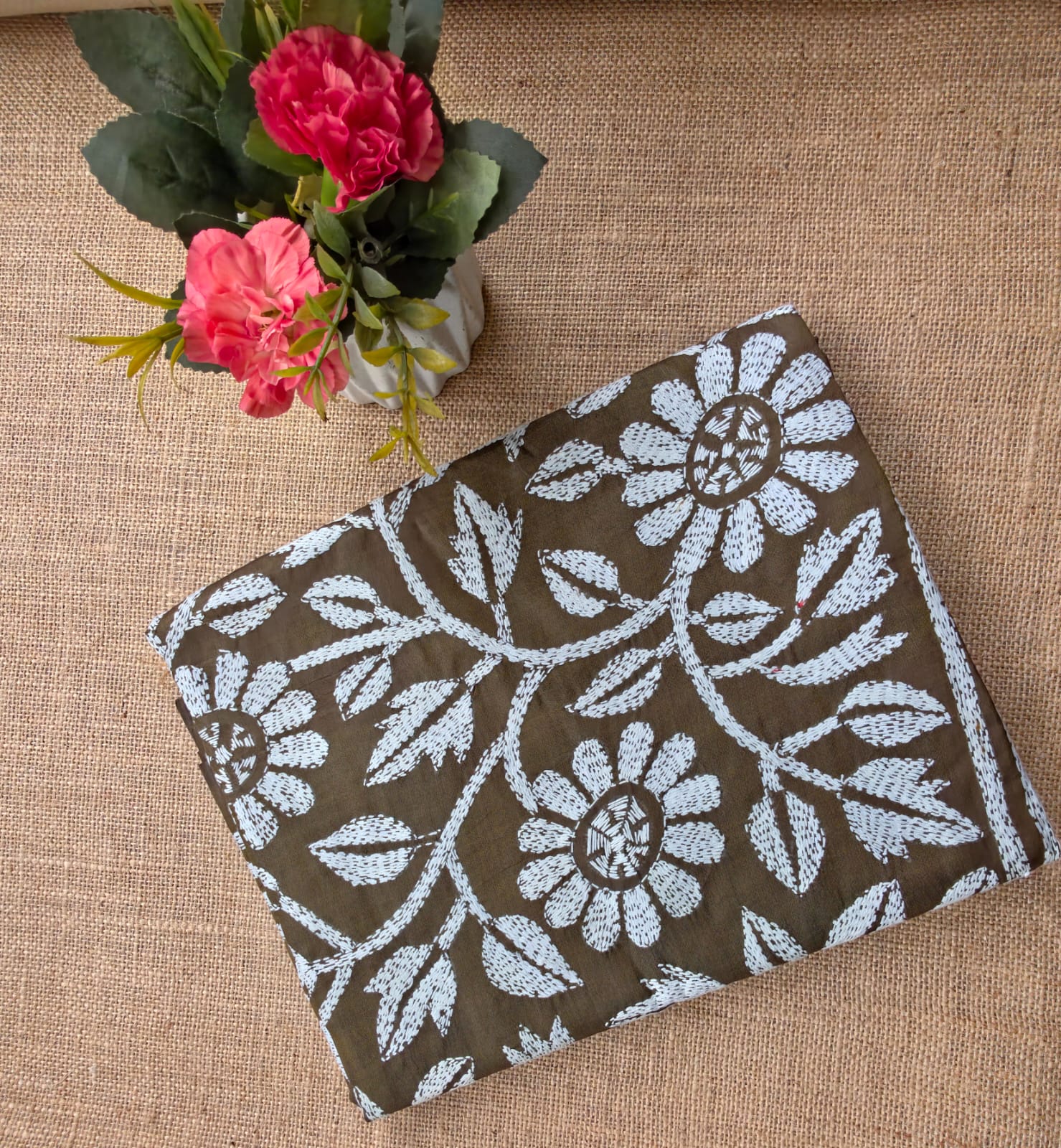 Wrap yourself in a piece of living heritage with this exquisite Bangalore silk saree, adorned with hand-embroidered Kantha stitch all over. Originating from the heart of Bengal, Kantha is a centuries-old craft where each running stitch tells a story—of blooming flowers, flowing rivers, and the artisan’s own dreams. Every motif is patiently hand-sewn, creating a soft, rippled texture that feels as rich to the touch as it looks to the eye.