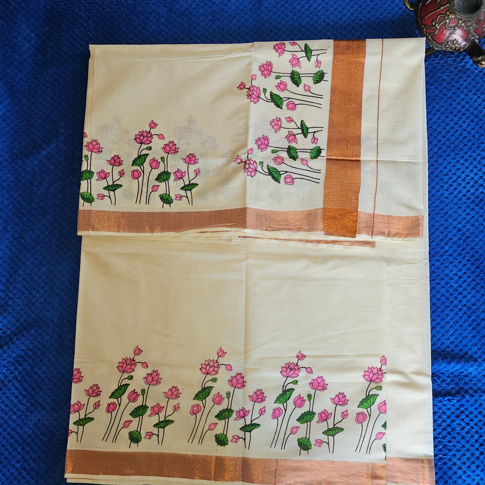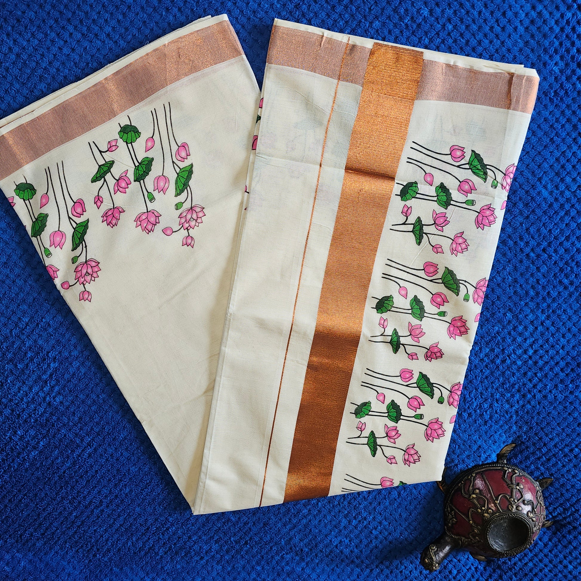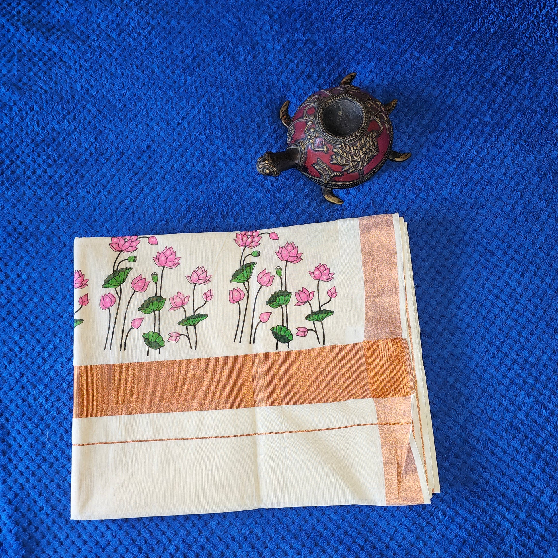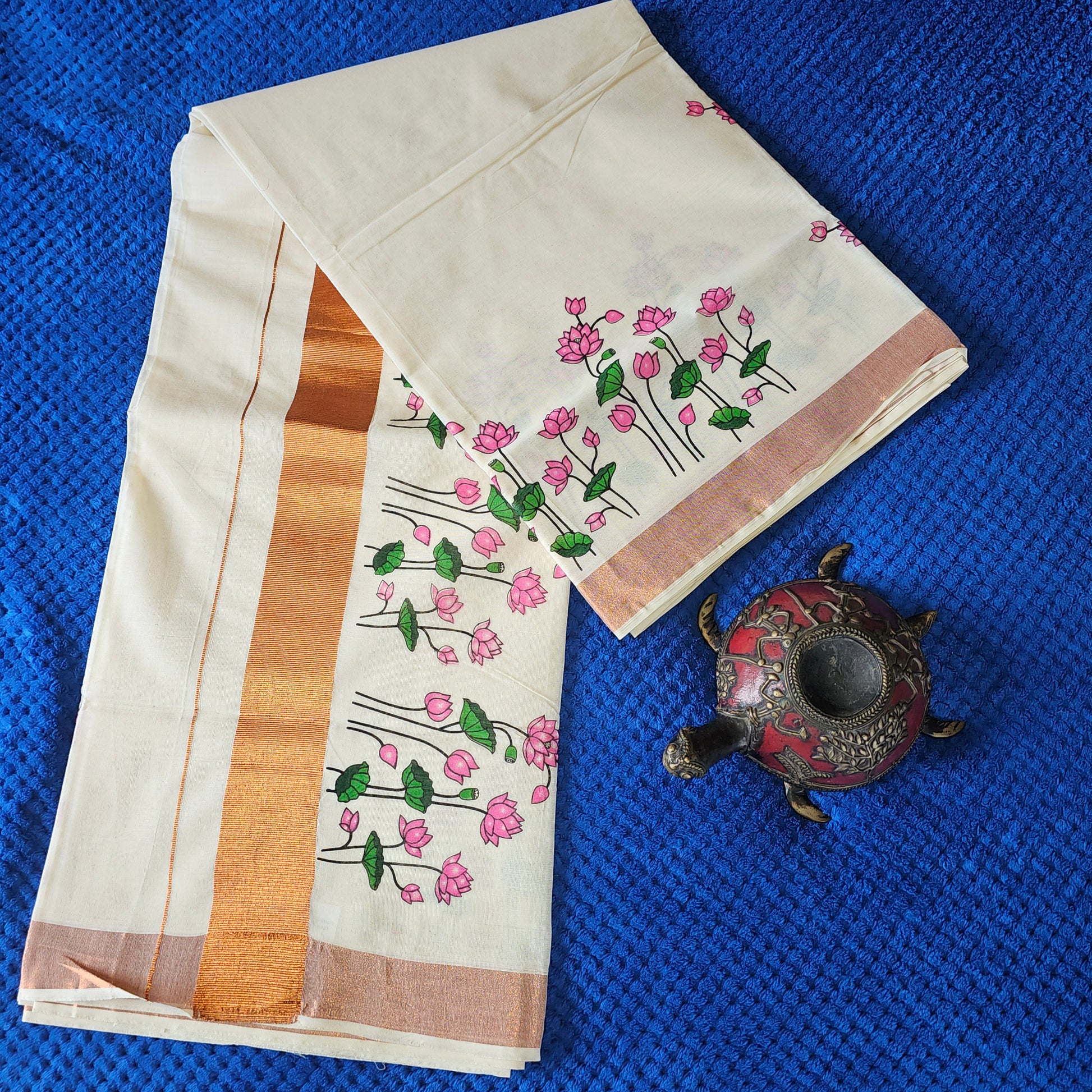 "Adorn yourself in the ethereal beauty of our Copper Mural Print White Kerala Saree, featuring delicate pink lotus flower borders. This lightweight, breathable saree blends traditional Kerala mural art with contemporary elegance—perfect for weddings, festive occasions, or cultural events. Handcrafted for grace and comfort."