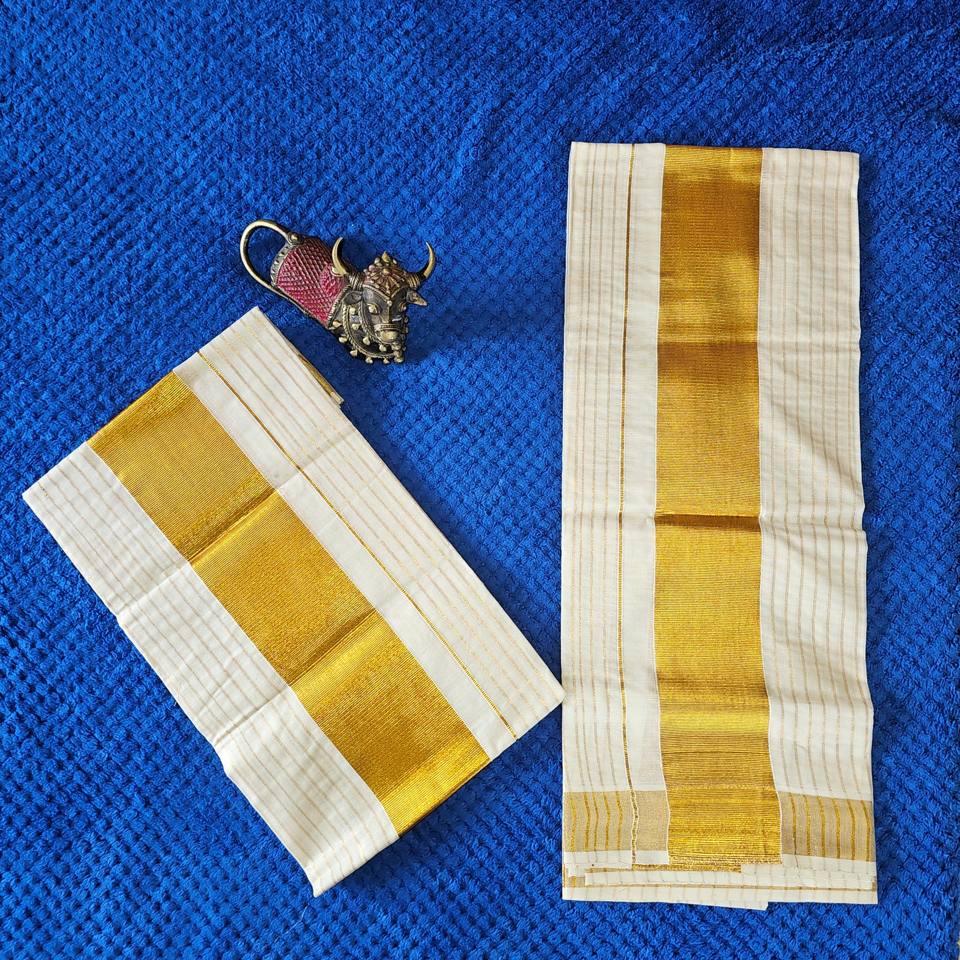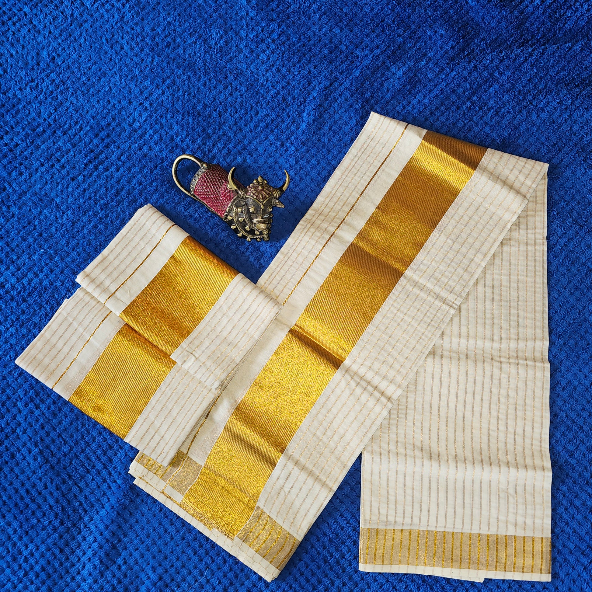 Elevate your traditional attire with this exquisite Kerala Set Mundu, featuring a classic Kasavu Kara (border) and elegant golden stripes running all over the body. Crafted from premium cotton, this off-white mundu offers unmatched comfort while exuding timeless Kerala elegance.
