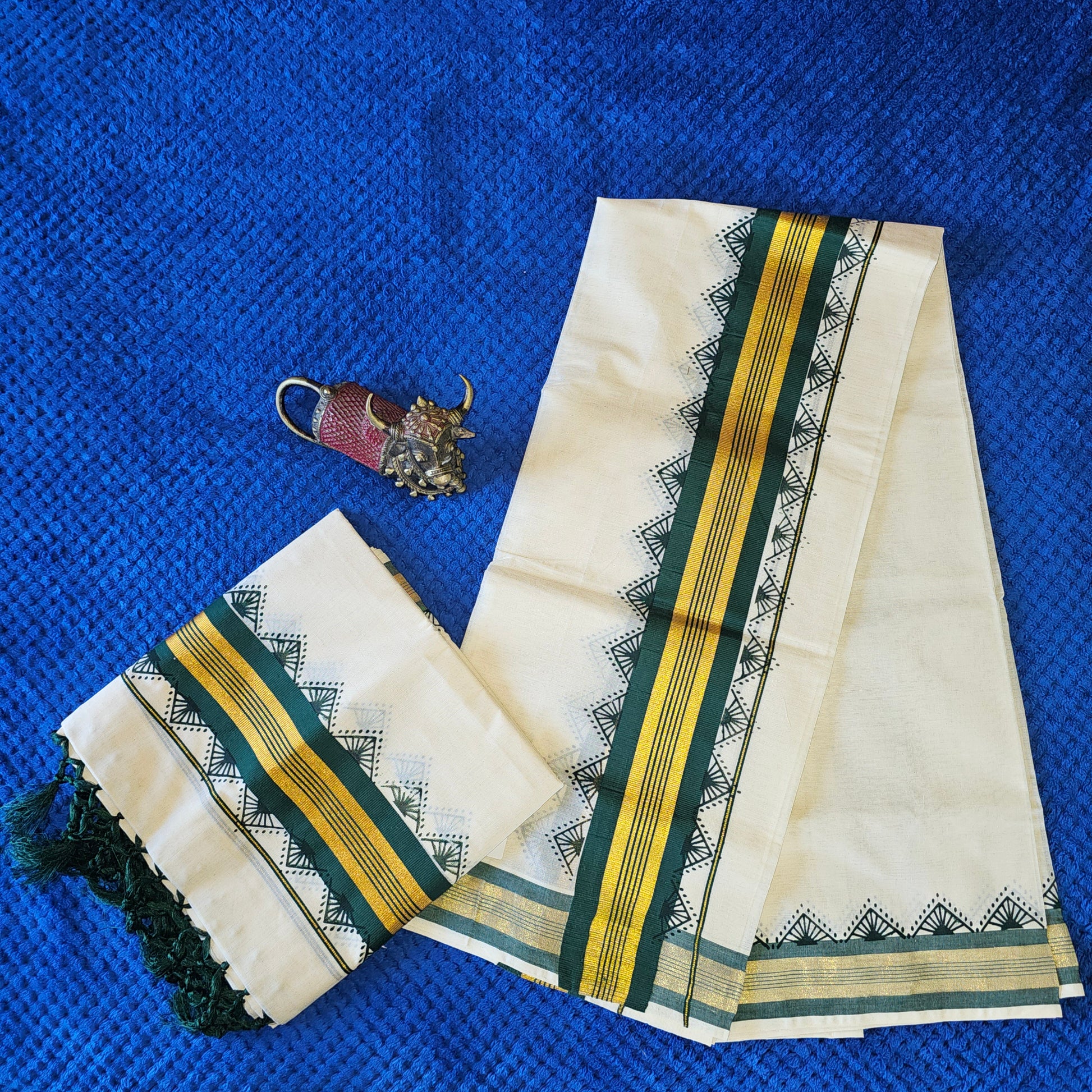 Border: Green with Golden Kasavu (Zari) and Zigzag Design