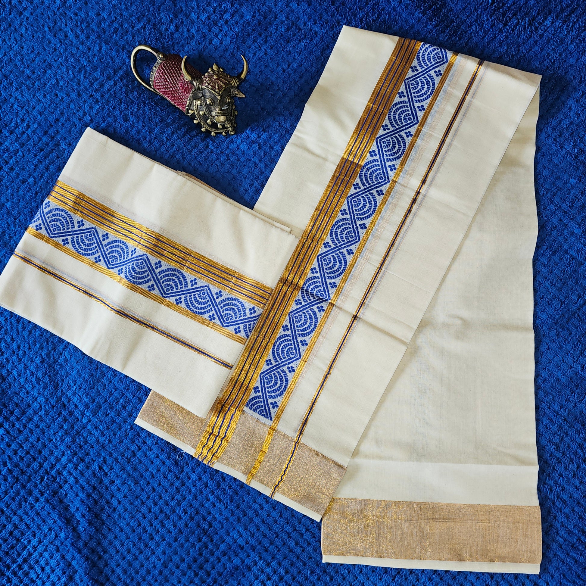 Kerala Set Mundu with Blue Motif & Golden Zari Border – Traditional Handwoven Elegance