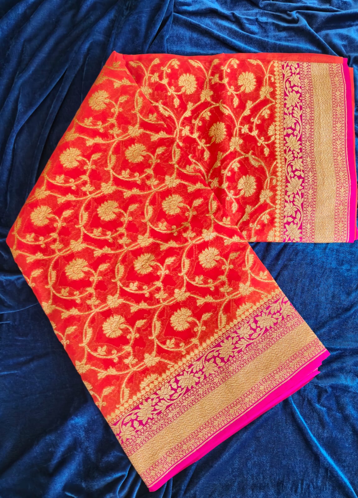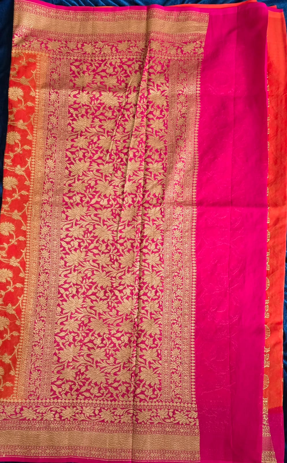 Colour: Vibrant Orange with Pink Contrast Border with Gold Zari
