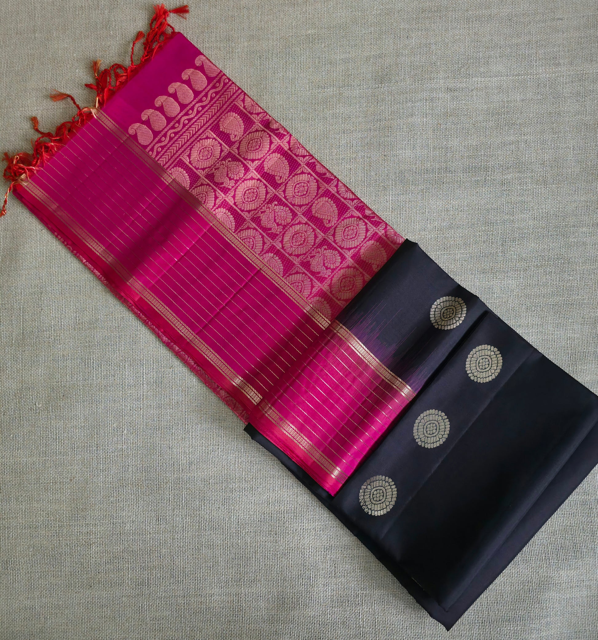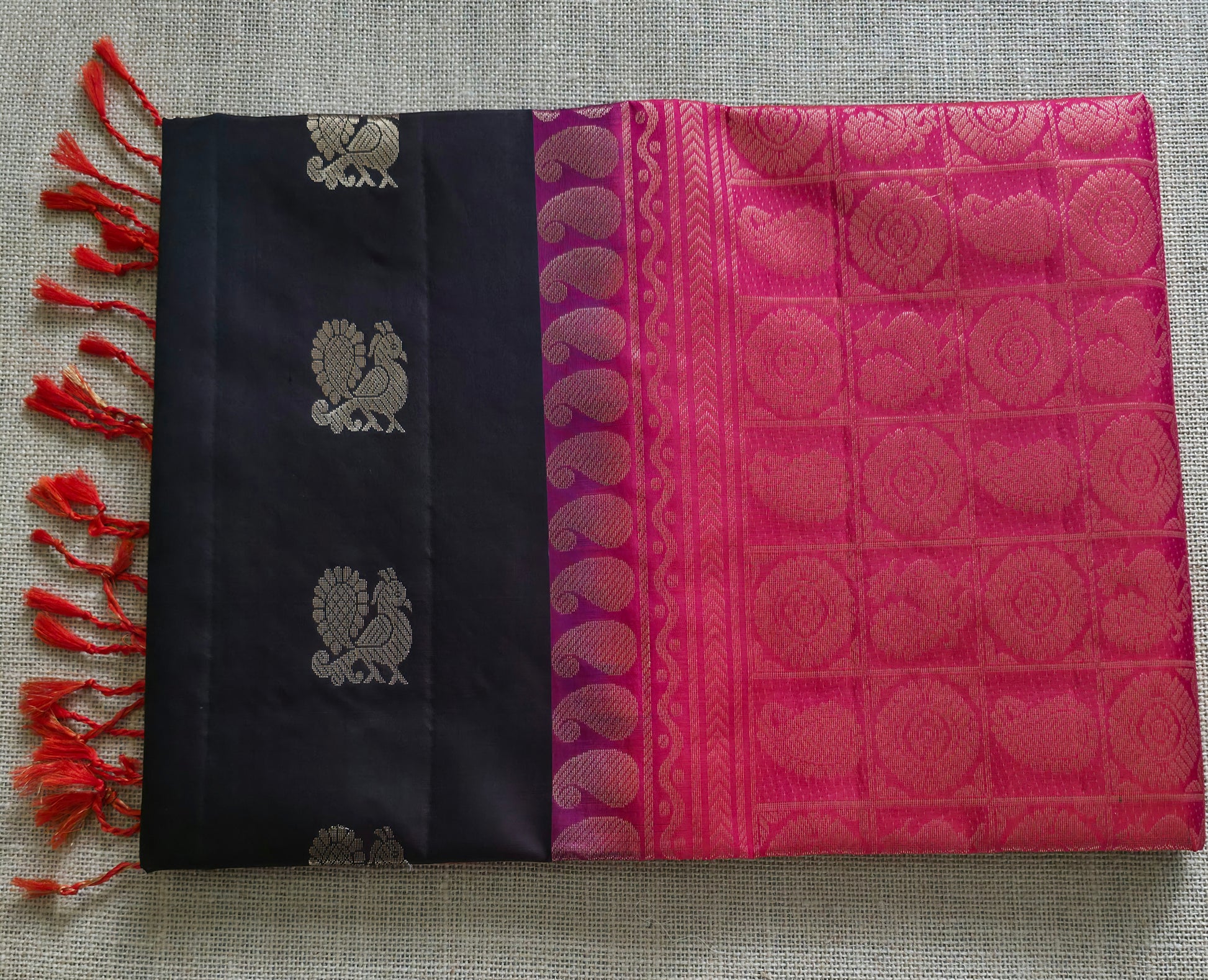 Pure Kanchipuram Brown colour Soft Silk with pink contrast border and pallu. Peacock motiff all over the body.