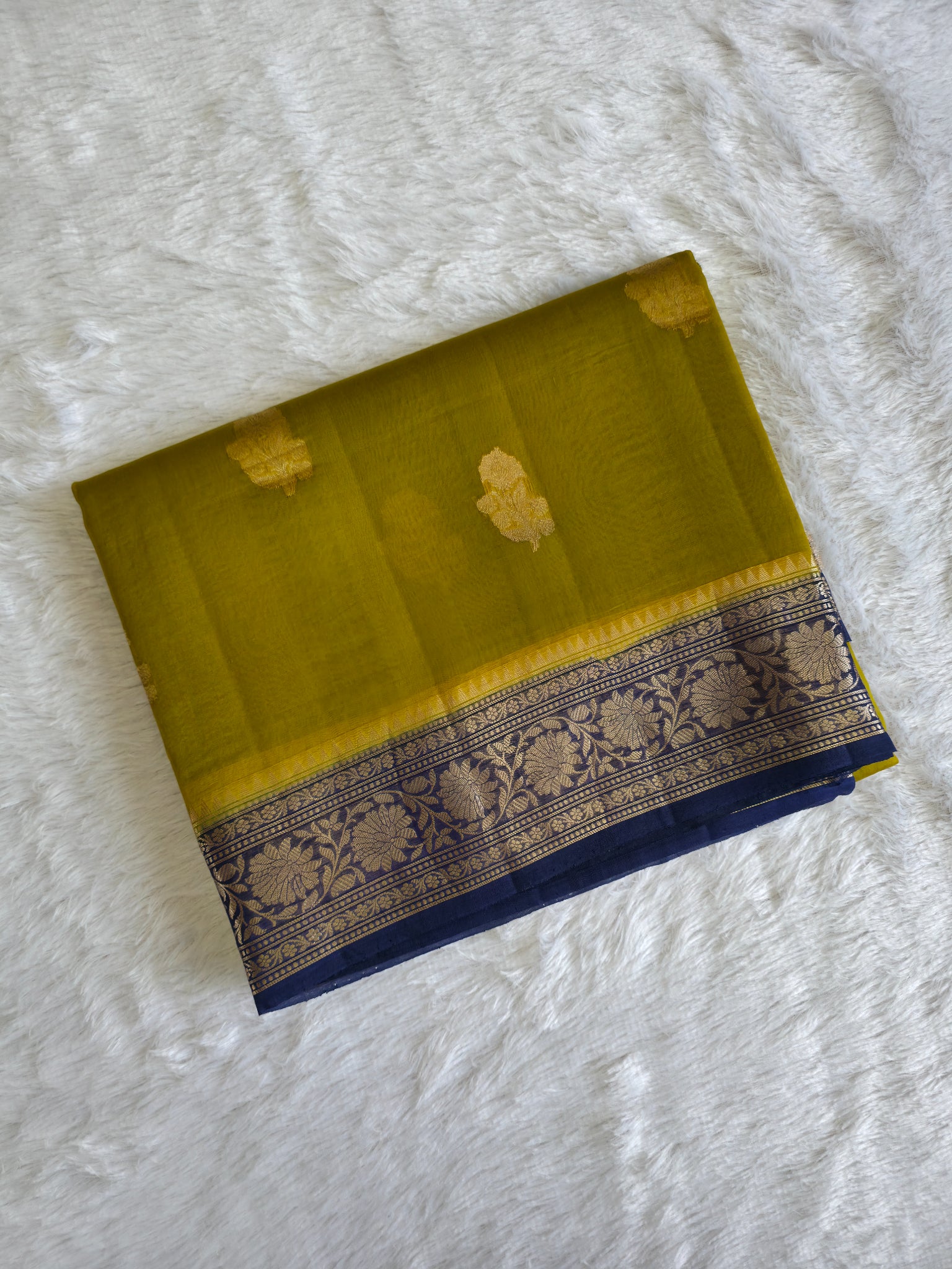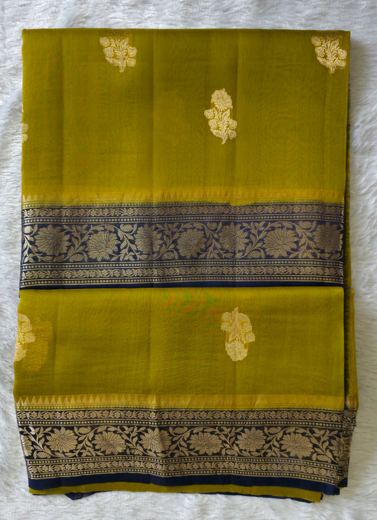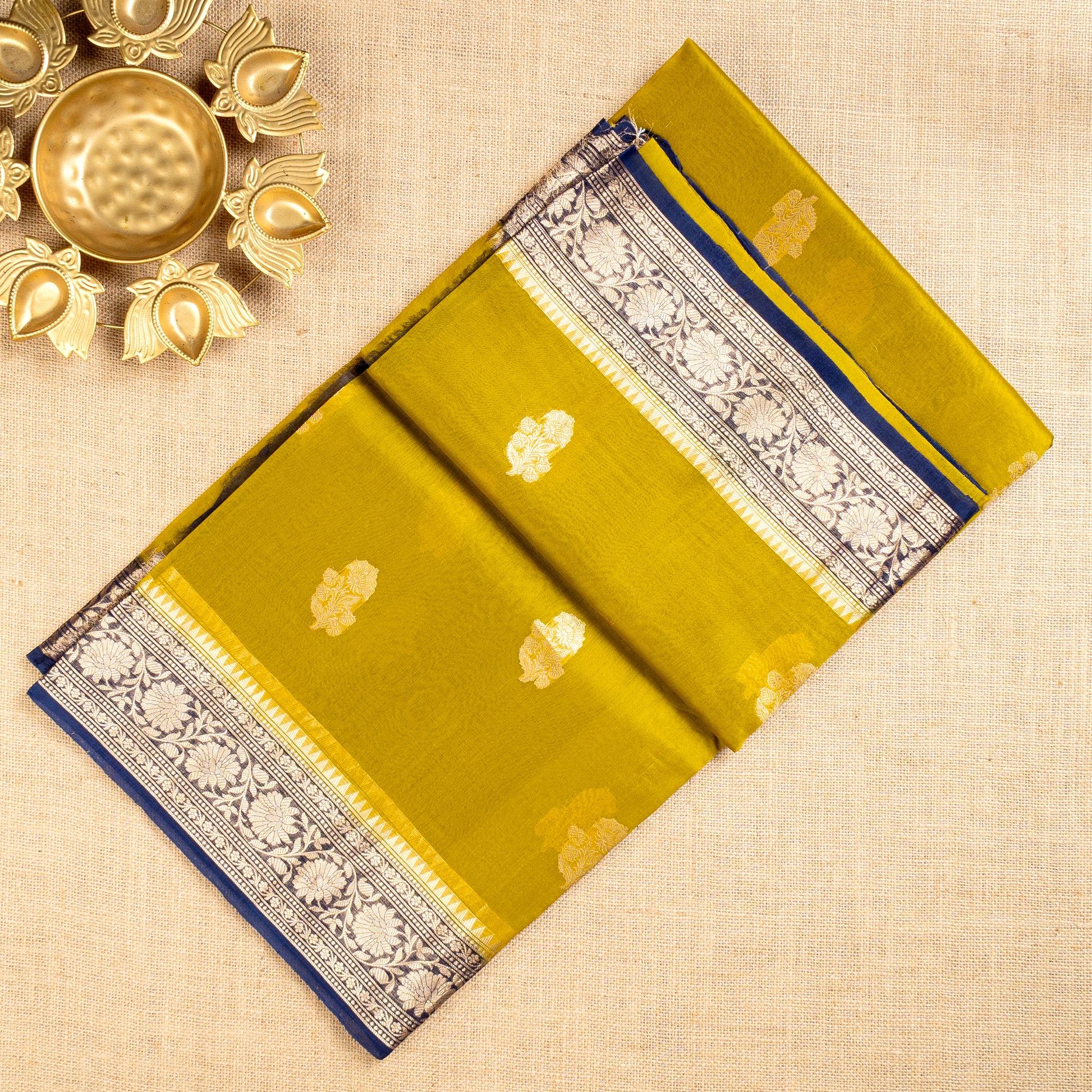 Pure Banarasi Organza Silk Saree Mehandi Green with Butti & Blue Contrast Border