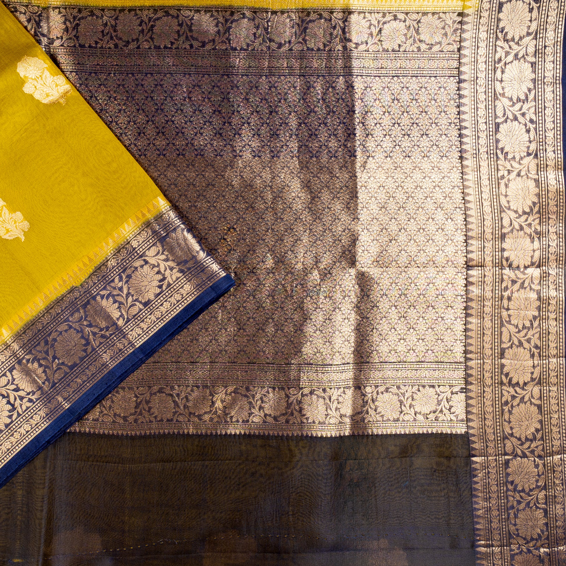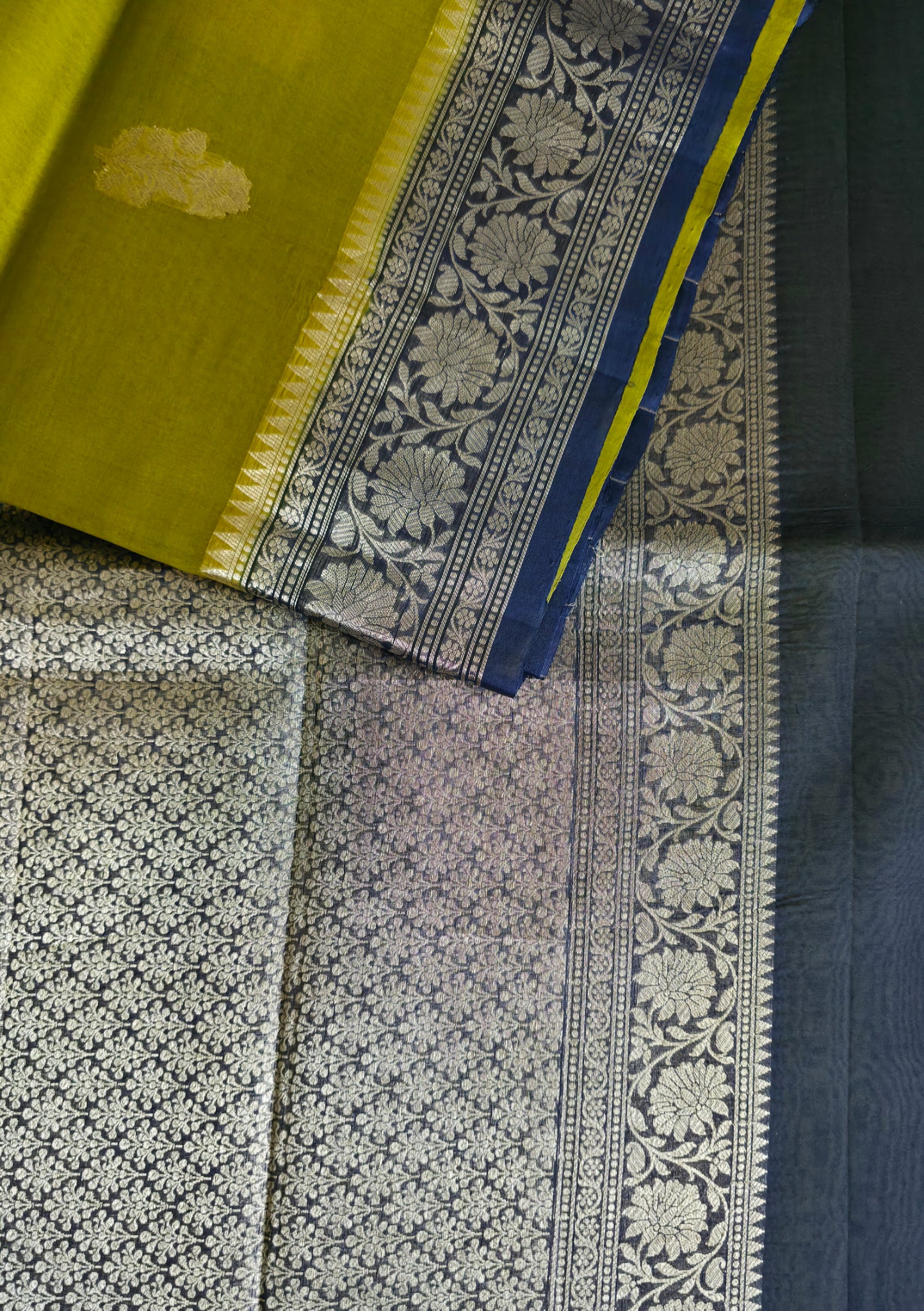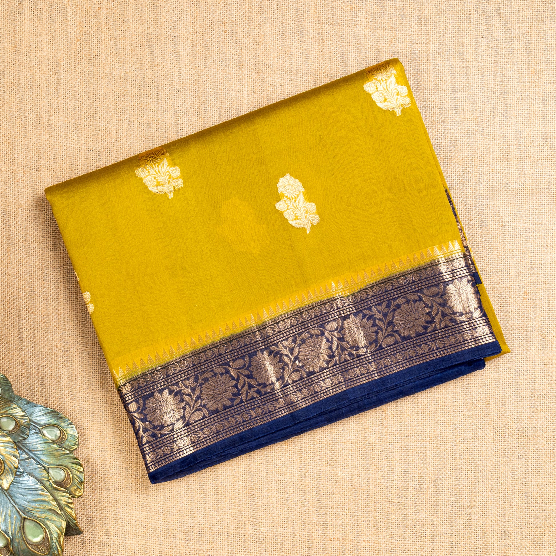 Pure Banarasi Organza Silk Saree Mehandi Green with Butti & Blue Contrast Border