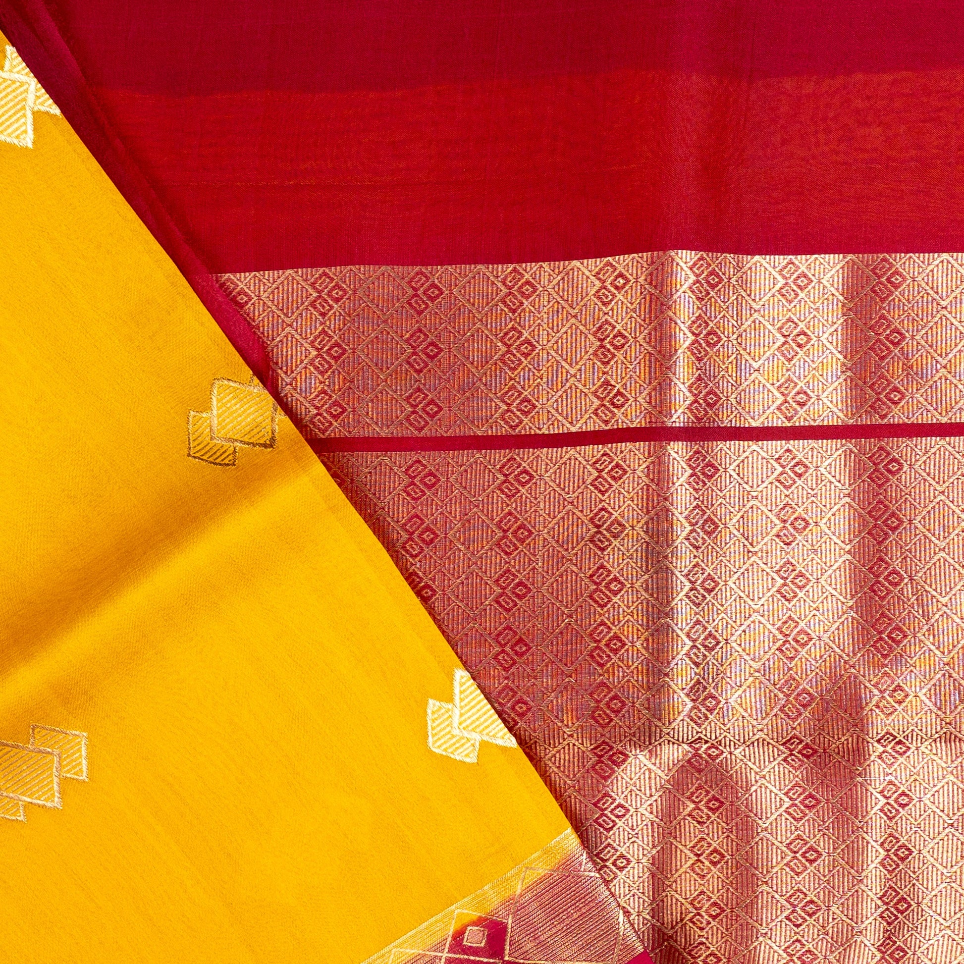 This Banarasi Pure Organza Silk Saree in a vibrant yellow shade is beautifully complemented by a striking contrast magenta border. The sheer, lightweight elegance of organza silk gives it a graceful drape, while the bold border adds a touch of regal charm.