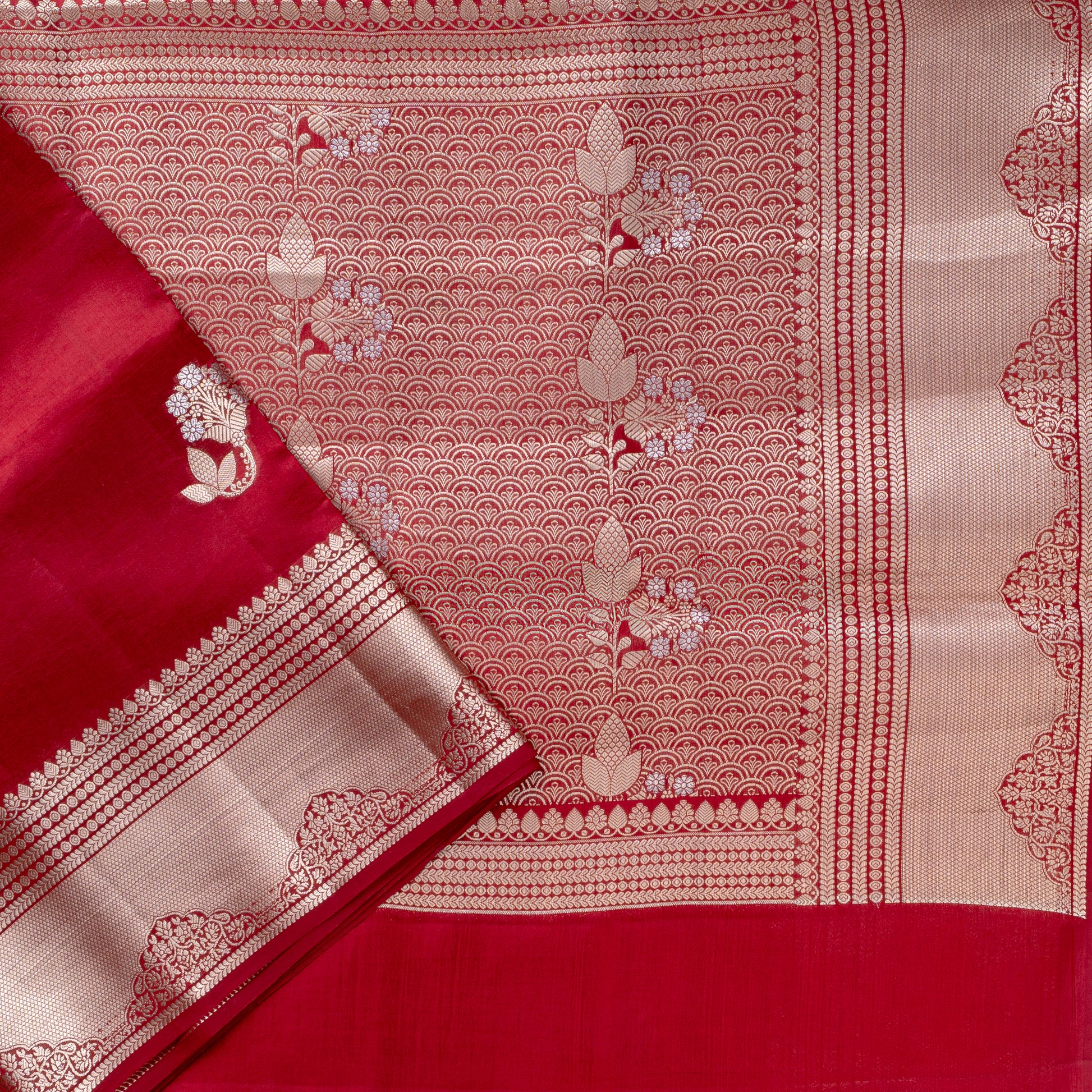 Banarasi Red Chiniya Silk Saree with Intricate golden motifs & border.The lustrous texture of chiniya silk, known for its natural sheen and lightweight feel, makes this saree a refined choice for both festive and bridal occasions.