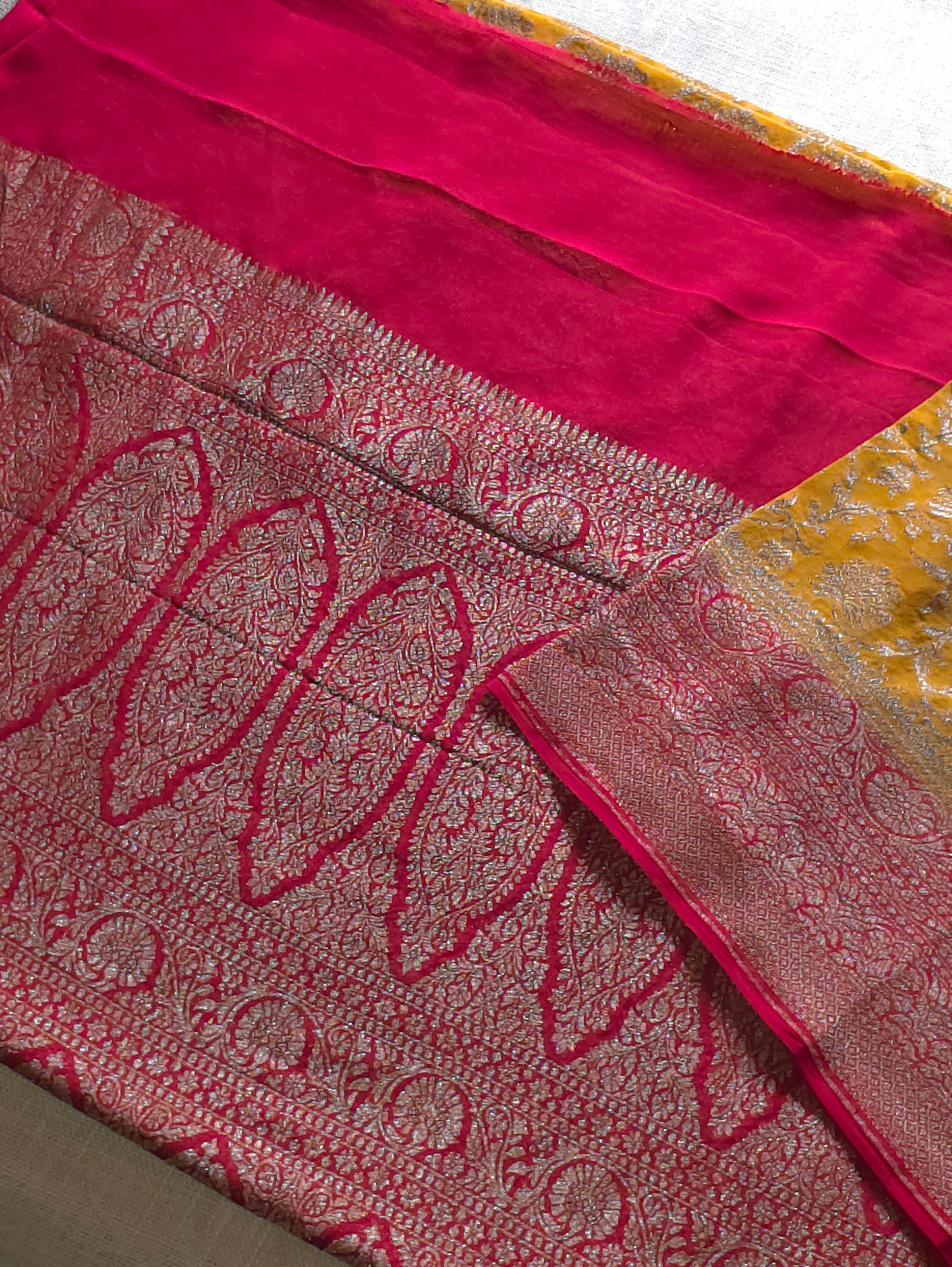 Banarasi Pure Silk Khaddi Georgette Saree with Contrast Yellow–Maroon Border & Floral JaalEpitome of Banarasi artistry, this pure silk khaddi georgette saree is adorned with an all-over floral jaal pattern that exudes timeless elegance. The drape is enhanced by a striking contrast border in yellow and rani pink, richly woven with zari for a regal finish.