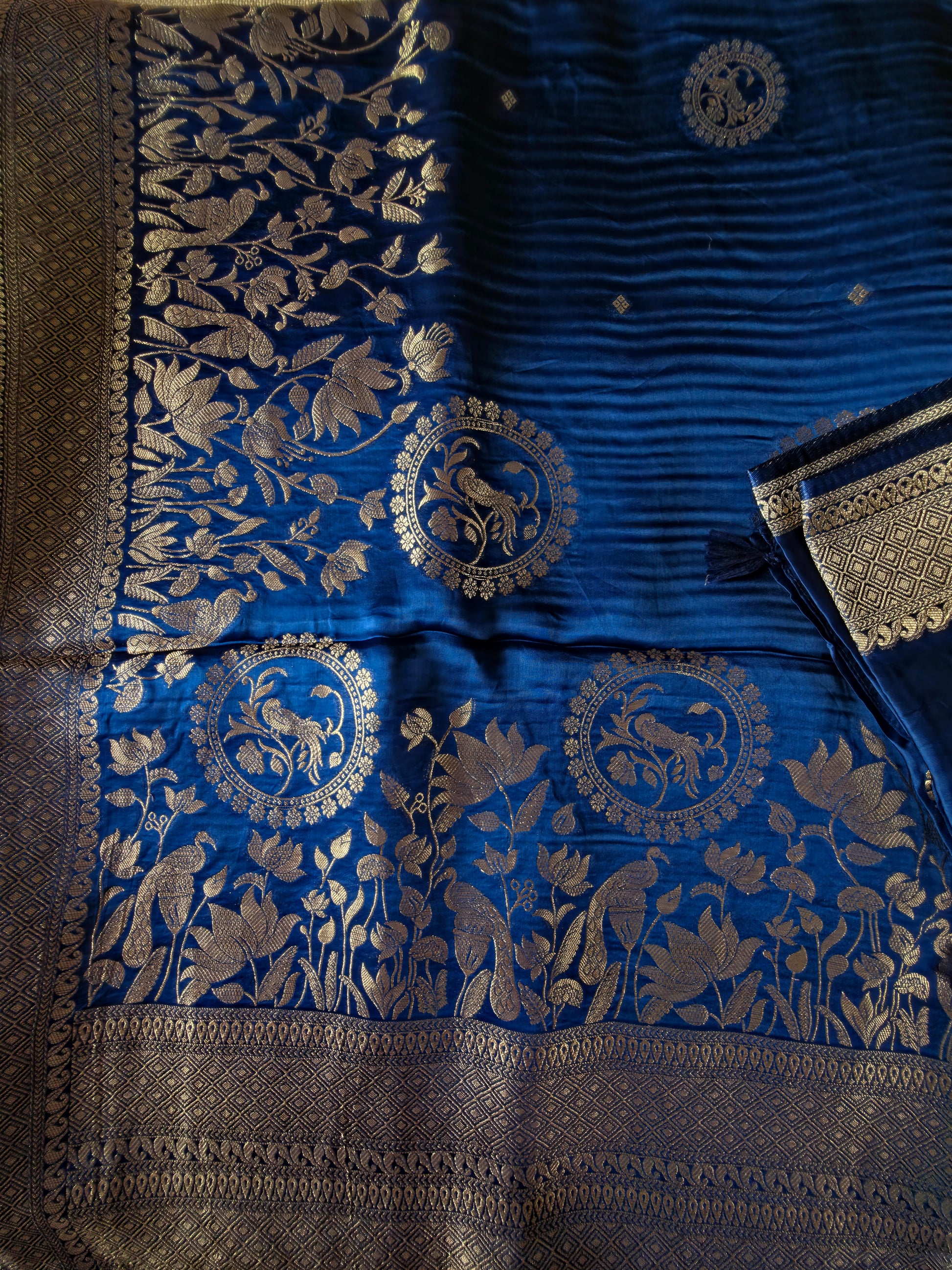 Beautiful flowy crepe blended silk in blue colour with golden floral motiffs. Timeless classic combination